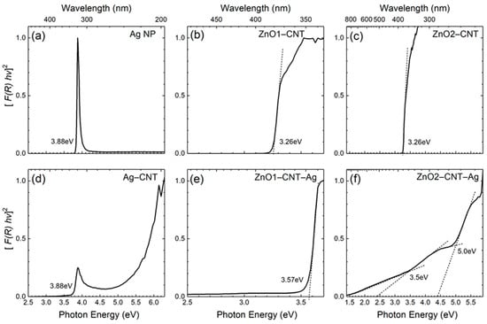 Tauc plots of the (a) free-standing Ag NP, (b) ZnO1–CNT, (c) ZnO2–CNT, (d) Ag–CNT, (e) ZnO1–CNT–Ag and (f) ZnO2–CNT–Ag nanohybrids.