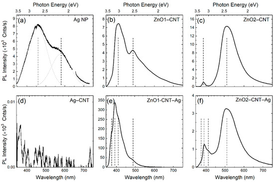 PL emission spectra of (a) pure Ag NPs, (b) ZnO1–CNT, (c) ZnO2–CNT, (d) Ag–CNT, (e) ZnO1–CNT–Ag and (f) ZnO2–CNT–Ag nanohybrids. Vertical dashed markers indicate major emission components discussed in the text.