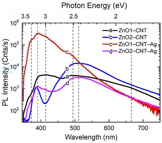 PL spectra at 300 K of (a) ZnO1–CNT, (b) ZnO2–CNT, (c) ZnO1–CNT–Ag and (d) ZnO2–CNT–Ag.