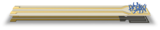 The 25 mm × 2.5 mm × 0.63 mm alumina (96% Al2O3, CeramTec, Plochingen, Germany) substrates had been cleaned with hot isopropanol and then dried in a stream of dry nitrogen. Gold (8846-G, ESL Europe, Reading, UK) interdigitated electrodes (IDE) and leads had been screen printed on the top side of the alumina substrate and a platinum (5545, ESL Europe, Reading, UK) meander type resistor with gold (8846-G, ESL Europe, Reading, UK) leads, which served as a sensor heater, was screen printed on the bottom side of the substrate (Figure 1). Then the as-prepared substrate has been fired in a furnace at 850 °C for 10 min and let to cool down to room temperature. The area of IDE had been painted with a brush with a colloid water solution of (200 ppm) gold nanoparticles [38] and the substrates were dried at 50 °C.