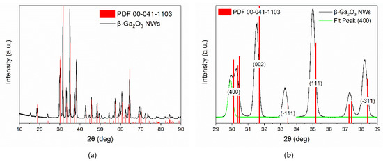 The crystal structure of the nanowires synthesized on the surface of the alumina substrate and the gold electrodes has been identified using the X-ray diffraction (XRD) method. The analysis of the results has shown that gallium oxide grown on these surfaces is of monoclinic structure and belongs to space group C2/m (Figure 9). The most prominent peaks of the diffractogram correspond to the (002), (11), (111), and (11) crystallographic planes. Their corresponding angles are, accordingly, 31.52°, 33.28°, 35.00°, and 38.21°. Additionally, a peak corresponding to the (400) surface with a 2θ angle equal to 29.91° was fitted from the data (Figure 9b). All peaks visible in the diffractogram are shifted by, approximately, less than −0.20° relative to the peaks in a diffractogram of bulk β-Ga2O3 (PDF 00-041-1103). We speculate that this phenomenon could originate from the high shape factor of the nanowires [41].
