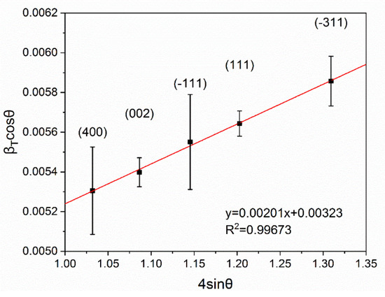 The five most prominent peaks in the X-ray diffractogram (Figure 9b) were used to calculate the strain and the average crystallite size. The micro strain has been determined from the Williamson–Hall plot (Figure 10) to be and the average crystallite size is (9):