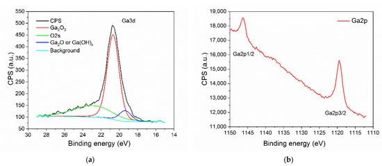 The analyzed sample consists mainly of Ga2O3 species which have been determined by deconvolution and analysis of Ga3d and Ga2p region (Figure 12). In the Ga3d region, the small peak visible at 19.5 eV may corresponds to either Ga2O or Ga-OH bond (Figure 12a). However, since the ratio of Ga/O has been determined to be 0.6, we believe that it is more likely that this peak corresponds to Ga-OH bond. The most prominent peak at energy of 20.6 eV relates to the presence of Ga2O3 at the surface [44,45]. O2s peak is present at the binding energy level of 23 eV. Region Ga2p also confirms the presence of Ga2O3 at the surface of the examined sample (Figure 12b). The Ga2p3/2 peak is visible at 1119.6 eV [44]. All observed peaks related to Ga are in agreement with literature data.