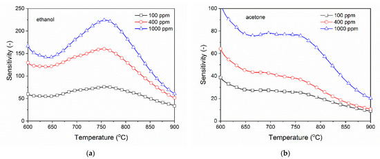 Sensitivity of β-Ga2O3 nanowires to volatile organic compounds: (a) The peak sensitivity to ethanol is at approximately 760 °C, (b) to acetone is at approximately 690 °C.