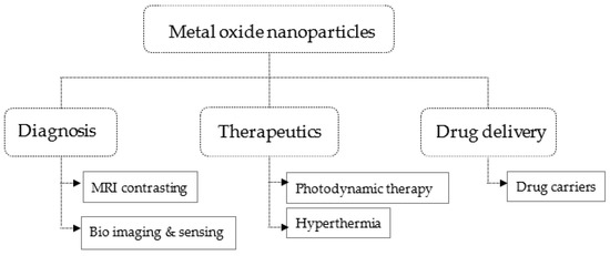 Metal oxides reported as a drug carrier for curcumin include TiO2, CuO, ZnO, Fe3O4, and CeO2. These metal oxides are observed to have relatively less harm for biological systems [19,21,22] and thus have been applied as a carrier for curcumin. They possess several beneficial features for biomedical applications besides their relatively less toxicity to normal biological cells. The biomedical applications of metal oxides are summarized in Figure 1.