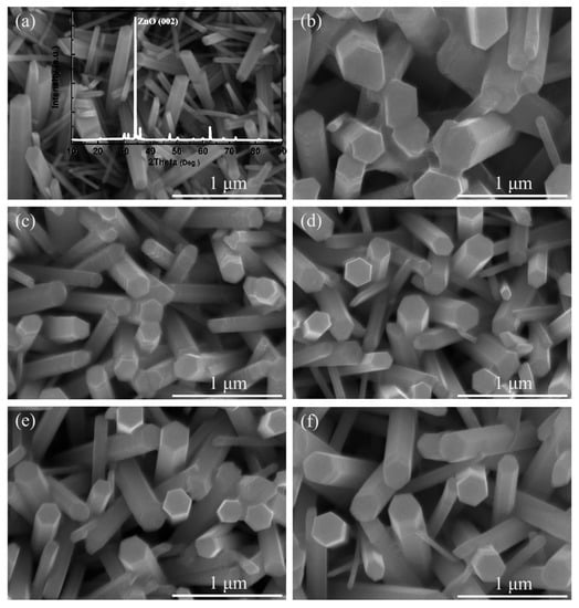 Figure 1. (a)–(f) SEM images of ZnO and ZnS/ZnO nanocomposites with different immersion time of 5, 15, 30, 45, and 60 min, respectively.