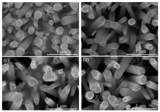 Based on the ZnS/ZnO nanocomposites, the ZnS/ZnO samples with the immersion time of 30 min in Na2S solution were then immersed in 0.02 M AgNO3 aqueous solution for 15, 30, 45, and 60 min, respectively, which allows for the Ag2S/ZnS/ZnO nanocomposites to be obtained. The morphologies of the as-synthetized Ag2S/ZnS/ZnO nanorod arrays are shown in Figure 3a–d. It can be seen that after immersion, the nanorods were covered with spherical nanoparticles at the short immersion time. Because of the difference between the solubility product constant (Ksp) of ZnS (2.93 × 10−25) and Ksp of Ag2S (6.69 × 10−50) [43], the cation exchange process occurs where zinc ions are replaced by silver ions, leading to the formation of Ag2S, which indicates that the spherical nanoparticles are Ag2S. With the increasing immersion time, the nanorods demonstrate a complete shape change from hexagon to ellipse. These results suggest that Ag2S was successfully deposited onto the surface of the nanorods.