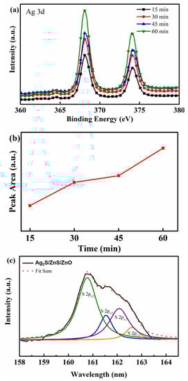 To further investigate the structures of Ag2S/ZnS/ZnO nanocomposites, XPS measurements were measured. Figure 5a shows the Ag 3d region of the XPS spectra. The peak position of Ag 3d5/2 is located at about 368 eV. This value is in good agreement with the reported values for Ag2S. Then, the peak area of Ag elements with different immersion time was calculated, as shown in Figure 5b. It is obvious that the Ag concentration increases with the increasing immersion time. Meanwhile, according to the XPS spectrum, the Ag/Zn ratio increasing from 0.08 to 0.22 indicates the same results. This result is consistent with the SEM images shown in Figure 3. Figure 5c shows the S 2p region of the XPS spectrum with the immersion time of 60 min. The black line represents the experimental data, and the red dots correspond to the fitted curve. Four labelled fitting Gaussian peaks were used to fit the experimental data. The binding energy of the S 2p3/2 peak located at 161.5 eV is in accordance with the binding energy of ZnS. The lowest energy peak of S 2p3/2 is located at 160.93 eV, which corresponds to Ag2S [44,45,46,47]. These results illustrate that Ag2S/ZnS/ZnO nanocomposites were formed after immersion.