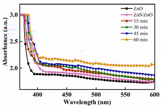 To investigate the optical properties of Ag2S/ZnS/ZnO nanocomposites, UV-vis absorption spectra from 350 to 600 nm were examined. For comparison, the spectrum of pure ZnO nanorods was also measured, indicated by the black line. Figure 6 shows the UV-vis absorption spectra of Ag2S/ZnS/ZnO nanocomposites with various immersion time, revealing that the absorption edge of ZnO is extended to the visible region by decoration with Ag2S because of its narrow bandgap of ~1.1 eV. When visible light is observable on the nanocomposites, hole-electron pairs are generated in Ag2S, leading to the absorption in visible light. With the increasing immersion time, more amounts of Ag2S are deposited, thereby causing the increase in absorption in the visible light region.
