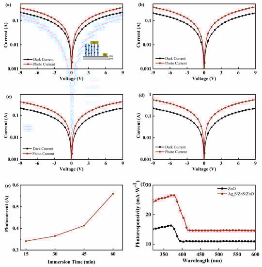 A photodetector was fabricated with In electrodes to investigate the optoelectrical properties of Ag2S/ZnS/ZnO nanocomposites. The I-V characteristics of photodetectors with various immersion time under 365 nm UV LED are shown in Figure 7a–d. It can be observed that photodetectors have a photoresponse under UV illumination. The reverse current is high and of the same order of magnitude as the direct current, demonstrating that photoconductive photodetectors were fabricated. At the same voltage, the photocurrent of photodetectors with various immersion time changes from 0.34 to 0.56 A under UV illumination. Meanwhile, the dark current of the photodetectors, which can be ascribed to oxygen vacancy in ZnO, is 0.22, 0.20, 0.21, and 0.22 A, respectively. Thus, the on–off ratio of the photodetectors at a bias of 9 V is 1.53, 1.77, 1.94, and 2.47, respectively. Figure 7e shows the photocurrent of photodetectors with various immersion time under 9 V bias. It is observed that the photocurrent increases with the increase in immersion time. This phenomenon can be attributed to the replacement of ZnS by Ag2S. The photoresponsivity of the photodetector with the immersion of 60 min is shown in Figure 7f. It can be observed that the photoresponsivity increases for the Ag2S/ZnS/ZnO nanocomposites when compared with pure ZnO photodetectors not only in UV regions but also in the visible wavelength region. In addition, the UV-to-visible rejection ratio was improved from 1.48 to 1.82.