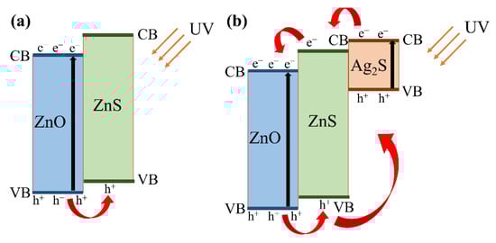 Figure 8. Energy band schematic diagrams of different nanocomposites: (a) ZnS/ZnO; (b) Ag2S/ZnS/ZnO.