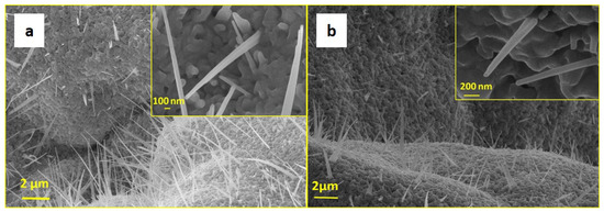 (a) Scanning electron microscopy (SEM) micrograph of sample A; (b) SEM micrograph of sample B-Sn. Insets show the details of single nanowires (NWs) at high magnification.