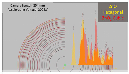 To analyze all the electron diffractions, we used the JEMS software [40]. As far as the phase analysis of the Zn-O systems, a complete recent review is given in reference [41]. Zinc oxides exist in two different stoichiometric crystallographic forms: (i) the ZnO hexagonal form and (ii) the ZnO2 cubic form. Figure 10 shows the 3D representation of the two crystal structures, and Figure 11 provides the comparison of the theoretical electron diffraction of the two oxide forms by the JEMS software. The form factors used in the analysis were derived from the Mott electron-scattering cross section.