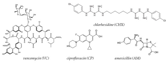 AM, a very common wide-spectrum β-lactam antibiotic that inhibits bacterial cell wall synthesis, is administered to patients either orally or topically. As at least 50% of AM is not retained by the body, the potential for removal from environmental aqueous samples is of interest [15]. Another study concerns AM removal from aqueous solution using magnetically modified graphene nanoplatelets [16]. VC, a first-line glycopeptide antibiotic used in the treatment of infections caused by Gram-positive bacteria, such as Staphylococcus aureus, is always the drug of choice for antibacterial wound dressing [17,18]. CP is a second-generation fluoroquinolone, particularly effective against Gram-negative bacteria. Carboxymethylated NC has been used to fabricate a ciprofloxacin–montmorillonite composite for its sustained delivery [19]. CHX is a cationic bisguanide widely used in dentistry and cosmetic fields due to its antiseptic activity. In the literature, the controlled release and antimicrobial activity of CHX added to cellulosic substrates were investigated with microfibrillated cellulose [20] and nanocrystal membranes [21].