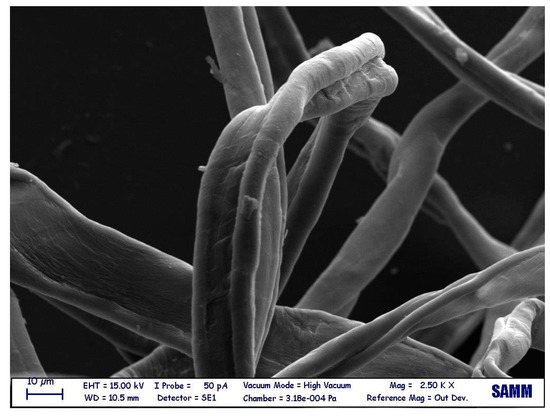 The CFT fibrous morphology was captured by an SEM image (Figure 3), which defines the actual dimensions of the micrometric cellulose fibers, in addition to their shape. The CFT SEM image is equal to untreated cotton fiber SEM images reported in the literature.