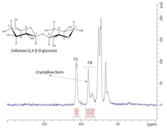The 13C NMR analysis was performed by using Dipolar Decoupling Cross Polarization Magic Angle Spinning (CP-MAS) technique with a 13C 75.47 MHz Bruker Avance 300 spectrometer (for Bruker S.r.l., Milan, Italy). Concerning data acquisition parameters, the repetition time (D1) was equal to 8 s, while the contact time and the spin rate were 1.6 ms and 10,000 Hz, respectively. To obtain good quality spectra, 2K scans were collected. The samples were positioned in a zirconium rotor (diameter: 4 mm; height: 21 mm). Tetramethylsilane was the reference substance for the chemical shifts. Benzene was used as a secondary reference standard. The crystallinity index (CrI%) of nanocellulosic materials was evaluated by means of the following equation used in our previous works, see Equation (2) [12]: