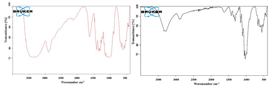 The solid phase FT-IR spectra of the powdered sample with infrared-grade KBr were generated using an ALPHA spectrometer (Bruker, Bremen, Germany). Data were analyzed using OPUS software, version 7.0 (Bruker, Bremen, Germany). The acquisition of the spectra was performed in the range of 4000–400 cm−1. The estimation of GMA molar substitution ratio (MS) was obtained with the method used in our previous works, see Equation (1) [12]: