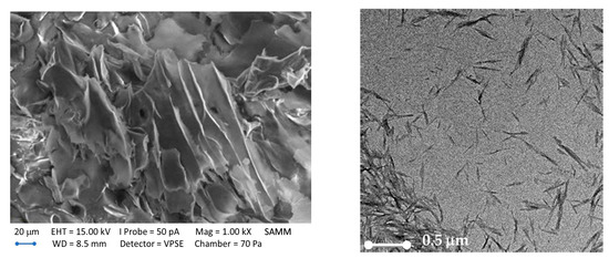 SEM on the left refers to lyophilized ONC in the form of aerogel. On the right, TEM validates the definition of ONC as cellulose nanofibrils (NFC), since the filaments have a length and width of about 100–200 nm and 10–20 nm, respectively.