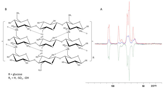 In the HNC cellulose NMR spectra reported in Figure 7A, the red trace is related to the components of the rigid molecular structure (CP-MAS experiment), while the high power decoupling magic angle spin (HP-DEC MAS), blue trace, is related to the high mobility components The difference spectrum (green trace) gives an idea of the morphological distribution between rigid and mobile components (signal intensity normalized to signal noise). Figure 7B reports in the central chain the scheme of the hydrogen bonds of the beta sheets, which are the basis of the crystalline form of cellulose. The surface chains as well as the folds induce greater freedom to the glucose residues and primary alcohol derivatizations are possible, as in the case of treatment with sulfuric acid or the oxidation process.