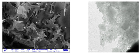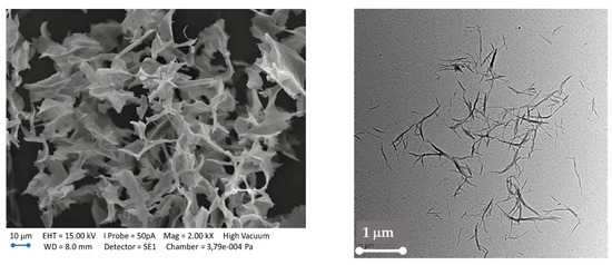 The hydrolysis of glycosidic bonds of starting cellulose chains promoted by sulfuric acid (H2SO4) breaks the cellulose fibers, providing a white powder. Consequently, CFT morphology underwent a microscopic alteration with respect to CFT, as depicted by SEM and TEM images shown in Figure 6.
