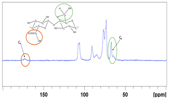 Figure 10 reports the ONC 13C CP-MAS NMR spectrum; the new signal at 177 ppm is attributed to the quaternary carbon of the introduced carboxyl group of ONC. The CH2OH oxidation is partial, as confirmed by the presence of C6 signals. ONC CrI% is equal to 65%.