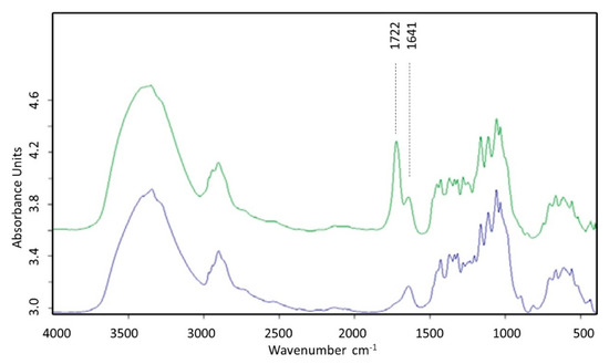 Figure 5 reports the CFT FT-IR and ATR FT-IR spectra that can be superimposed with the regular cotton spectra. While ATR mode allows the chemical analysis of the surface and it does not need any preparation of the sample, the FT-IR transmission analyzes the bulk on the powdered sample in KBr.