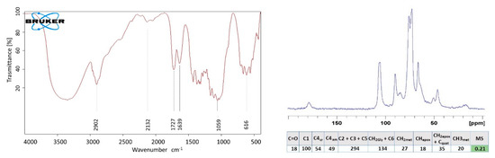 Figure 4 displays the CFT solid-state CP-MAS spectrum with the integrals. The spectrum puts into evidence the quite high purity of the sample and the crystallinity index of CFT (CrI = 62%), calculated as detailed in Section 2.5.2.