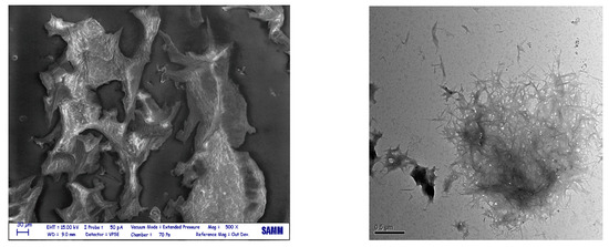 TEM: transmission electron microscopy imaging was carried out by using a Philips CM 200 instrument (Philips S.p.A., Milan, Italy) at 200 KV voltage. The samples were prepared by depositing a drop of solution on a copper grid (200 mesh) coated with a thin layer of carbon and then left to dry for a few hours before the observation.