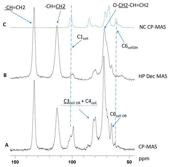 HNC 13C CP-MAS and HP-DEC MAS NMR spectra (A). Beta shift cellulose (B).