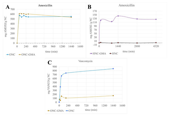 Amoxicillin (AM) (A,B) and vancomycin (VC) (C) kinetic studies. Adsorbate mg/g NC versus time.