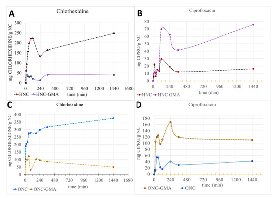 Ciprofloxacin (CP) (A,B) and chlorhexidine (CHX) (C,D) kinetic studies. Adsorbate mg/g NC versus time.
