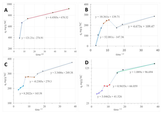 Intraparticle diffusion model: VC/ONC (A); CHX/HNC (B); CHX/ONC (C); CHX/ONC-GMA (D).