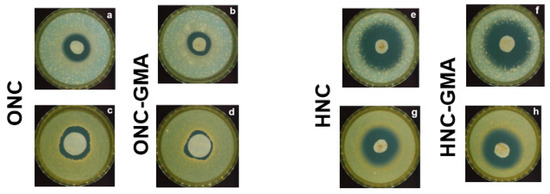 In vitro antibacterial tests described in Section 2.6 were performed on the two strategic drugs such as VC and CP, loaded on ONC and ONC-GMA and on HNC and HNC-GMA. The samples submitted to the antibacterial tests were found capable of recharging quite the same amount of VC and CP after an exhaustive washing procedure. Every test was repeated four times. Figure 19 reports for convenience one image for each test.