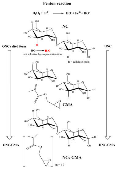 The synthetic route was the same for HNC and ONC. NCs on a 50–700 mg scale were soaked in water (preheated at 80 °C) for 30 min. Later, FeSO4∙7H2O and H2O2 (30% w/w) were added and the suspension was stirred for 25 min at 80 °C. After 25 min, GMA was dropped into the reaction mixture, and it was allowed to react for 15 min (80 °C). The reagent amounts are reported in Table 1.