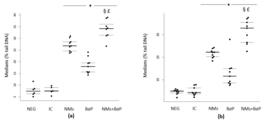 Evaluation of DNA damage using the comet assay following in vitro exposure of human (a) and rat sperm (b) to NMs+BaP. Tested concentrations: Negative control = Figure 1. S9 mix, 1% DMSO), NMs: aged CeO2 NMs at 1 µg·L−1; BaP: BaP at 1.13 µmol·L−1; NMs+BaP: aged CeO2 NMs at 1 µg·L−1 previously incubated with 1.13 µmol·L−1 BaP. p < 0.05, for differences compared versus *: negative control (NEG); §: vs. NMs, £: vs. BaP.