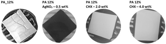 Examples of antibacterial activity test results for PAs n. 8 (PA_12%), n. 11 (PA 12% 0.5 wt% of AgNO3), n. 12 (PA 12% 2.0 wt% CHX), n. 13 (PA 12% 4.0 wt% CHX), and S. aureus CCM 4516. Around the CHX PAs, the inhibition zones are evident, whereas the other PAs show no inhibition zone. Only for the neat PA can bacterial growth on the material´s surface be observed.