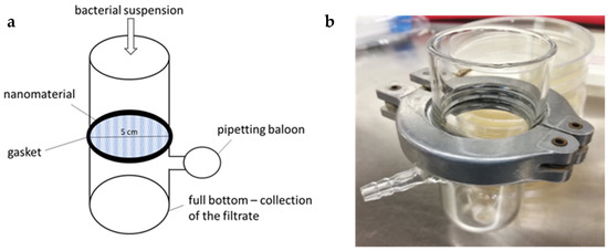 Glass was chosen as the most suitable material, which can be reused due to easy sterilization with heat, chemicals (e.g., ethanol), or UV radiation. The shape of the apparatus enabled the suspension to be filtered through the nanomaterial either by gravity or using a vacuum (for example, by a pipetting balloon connected to a side outlet). Of the different tested variants of gaskets, one commonly available in stores proved to be the most suitable in conjunction with sealing rubber. In summary, the resulting apparatus is made up of two straight glass tubes with a round-shaped nanomaterial with a 5 cm diameter inserted between them, and the two tubes are then joined with a gasket (Figure 3).