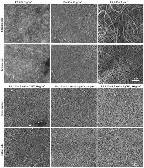 In total, 13 nanofibrous PA materials with different morphologies (fiber diameter, surface density, and air permeability) and concentrations of AgNO3 and CHX were tested (Table 1). PAs n. 1–n. 11 were characterized in the study of Lencova et al. [37], PAs n. 12 and n. 13 were characterized in this study. Examples of CHX PA structures are displayed in Figure 1. Among the most important parameters for evaluating a PA´s potential for practical use are the material morphology (incl. fiber diameter, surface density, porosity, air permeability, etc.) and homogeneity, indicating the overall material´s quality, mechanical properties, and water absorption. PA enables the production of homogenous structures with precise fiber diameters and similar pore sizes. These properties were confirmed for PAs n. 1–n. 11 [37] as well as the CHX PAs (Figure 1), where homogeneity, uniform, and evenly distributed fibers without any significant deviations or defects were observed. All of the properties are summarized in Table 1.