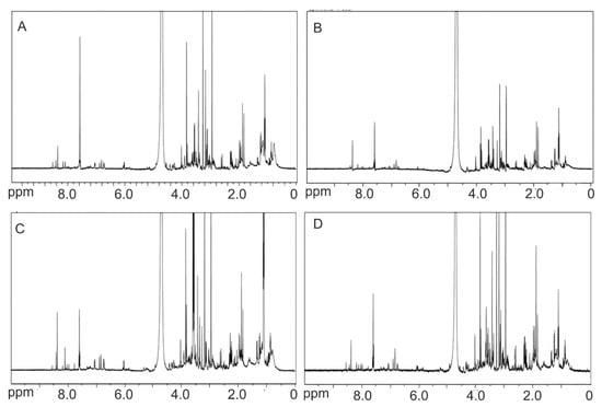 1H-NMR spectra of (A) control zebrafish and zebrafish treated with LC50 concentration of (B) non-doped, (C) N-doped, and (D) N,S-codoped CNDs.