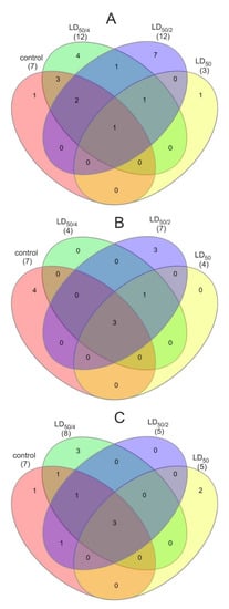 Venn diagrams of control and all tested concentrations of (A) non-doped, (B) N-doped, and (C) N,S-codoped CNDs; red denotes the control sample, green the sample treated with LC50/4, blue the sample treated with LC50/2, and yellow the sample treated with LC50.