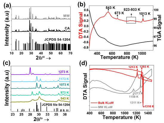 To understand in more detail the physical process that take place during the calcination step, transforming the seeds into the monoclinic KLuW crystalline phase, a Differential Thermal Analysis (DTA) and Thermal Gravimetric Analysis (TGA) of the seeds obtained by the MW solvothermal method, were performed. The thermograms of the seeds are provided in Figure 1b. The seeds were heated from room temperature to 1273 K. During the heating process from room temperature to 800 K, two peaks in the DTA curve were observed, associated to two weight losses in the TGA curve.