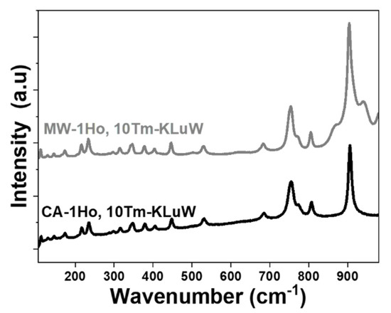Unpolarized Raman spectra of 1 mol% Ho, 10 mol% Tm:KLuW nanoparticles synthesized by the MW and CA solvothermal methodologies.