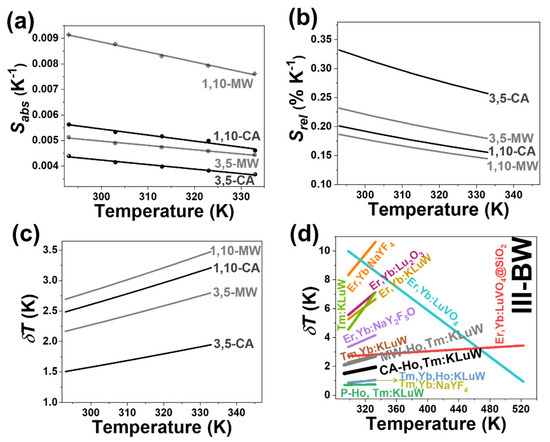 Having determined Srel and δT, now we can compare the performance of these nanocrystals with other sensors operating in the III-BW. The performance of 1 mol% Ho and 10 mol% Tm:KLuW synthesized by MW and CA is comparable to that of Tm, Yb:KLuW [66] and Er, Yb:LuVO4@SiO2 [67] (Figure 6d). Nevertheless, the performance of MW and CA nanocrystals is lower compared to the Tm, Yb, Ho:KLuW [66] and Tm, Yb:NaYF4 [66].