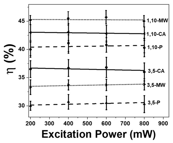 In addition, we explored the excitation power dependence of the photothermal conversion efficiency. The results obtained reveal that the change of the pumping power has no influence on the photothermal conversion efficiency (Figure 7). The increase of the concentration of Tm3+ favors the increase of the probability of multiphonon decay transitions, which in turn favors the generation of heat [29]. Also, it seems that the decrease of size of the material enhances the non-radiative processes to happen, which are responsible for the generation of heat. If we compare the morphology of these nanodimensional Ho, Tm:KLuW particles (see Figure 3), it can be noted that they tend to form agglomerates. However, small nanoparticles in the volume are located in the form of one-dimensional agglomerates, while larger ones are located in the form of three-dimensional agglomerates. Therefore, although the CA methodology produces larger particles, which should generate more heat under equal pumping conditions, as the magnitude of heat flux into the environment is proportional to the volume of the nanoparticles [68,69], the strong agglomeration observed in this system does not allow an effective use of their more advanced thermo-physical properties (large surface and volume) for heating the environment. On the contrary, small particles in solution in the form of branched filaments are much less agglomerated, therefore have better contact with the environment, which leads to higher heat transfer efficiency. This conclusion can be confirmed furthermore if we compare also the results obtained from the particles synthesized by the modified sol-gel Pechini method (see Figure 7). These particles tend to form big agglomerates, bigger than those of the nanoparticles synthesized via the solvothermal methodologies, leading to smaller heat efficiencies.
