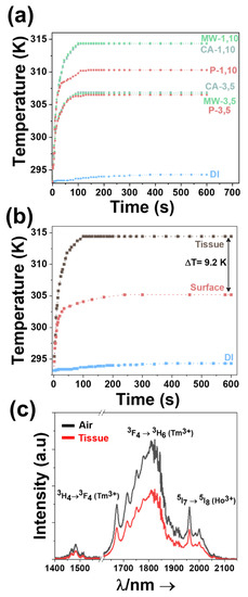 Laser-triggered photothermal therapy using near infrared excitation sources (NIR, λ = 700–1100 nm) is highly attractive due to deeper penetration in biological tissues, compared to ultraviolet (UV) or visible (VIS) light sources [8,9]. Photothermal agents that strongly respond to light excitation with NIR wavelengths and generate emissions within the biological windows can lead to non-invasive real-time temperature sensing in situ [1,2,3,4].