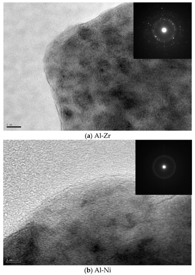 To verify the amorphous structure, the TEM and SAED patterns of Al-Zr and Al-Ni alloys powders were shown in Figure 2.
