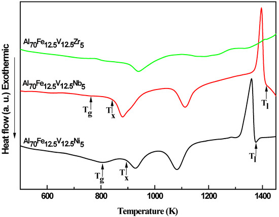 - Liu, X.; Wang, X.; Si, Y.; Zhong, X.; Han, F. Crystallization Behavior of Al70Fe12.5V12.5Nb5 Amorphous Alloy Formed by Mechanical Alloying. Materials 2019, 12, 383. [Google Scholar] [CrossRef] [PubMed]