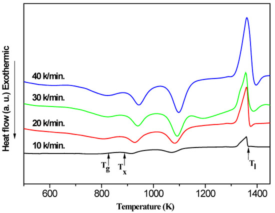 The thermal properties of the glass transition temperature (Tg), the onset crystallization temperature (Tx), the liquids temperature (Tl), the heat capacity step (∆Cp, the heat capacity difference between the supercooled liquid and glass at Tg) by NETZSCH Proteus software program are listed in Table 1.