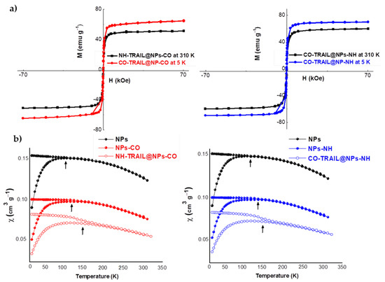 (a) Hysteresis loops recorded at 310 and 5 K on NP-CO2H-TRAIL and NP-NH2-TRAIL hybrids. (b) Thermal variation of the DC magnetic susceptibility of bare NPs, nanohybrids, and the related NH-TRAIL@NPs-CO and CO-TRAIL@NPs-NH nanovectors, measured at 200 Oe on as-produced powders. The arrows indicate the blocking temperature (BT).