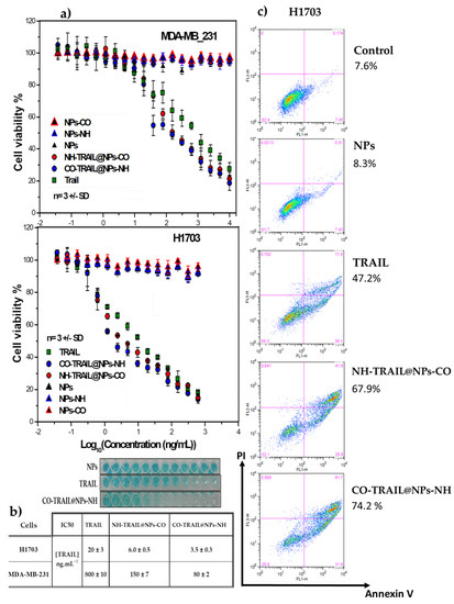 NPs alone and nanohybrids without TRAIL showed no deleterious effect on MDA-MB-231 or on H1703 cell lines (Figure 6). Nanovectors induce a dose-dependent degradation in cell viability with a median lethal concentration (IC50) ranging between 3 and 6 ng mL−1 for H1703 and between 80 and 150 ng mL−1 for MDA-MB-231, substantially lower than for TRAIL alone (IC50 approx. 20 and 800 ng mL−1, respectively), as summarized in Figure 6b. Using annexin-V/PI, we established that NH-TRAIL@NPs-CO and CO-TRAIL@NPs-NH induce apoptosis with a significantly greater efficiency than TRAIL. Apoptosis is highly enhanced by NH-TRAIL@NPs-CO (67.9 ± 3.5)% and CO-TRAIL@NPs-NH (74.2 ± 2.5)% stimulation compared to free TRAIL (47.2%) or bare NPs (8.3%), as illustrated in Figure 6 for the H1703 cell line.